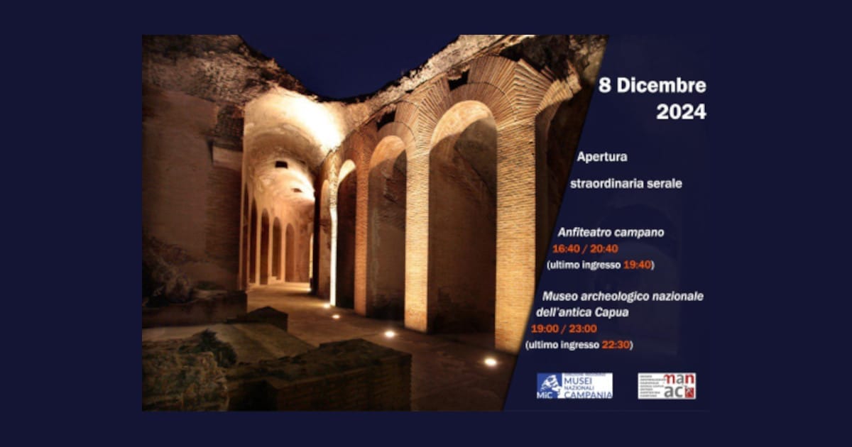 Caserta. Domenica 8 dicembre 2024, la Direzione regionale Musei nazionali della Campania unitamente alla Direzione dell’Anfiteatro campano, del Museo archeologico nazionale dell’antica Capua e del Mitreo di Santa Maria Capua Vetere, annuncia l’apertura straordinaria serale del sito nel Giorno dell’Immacolata.