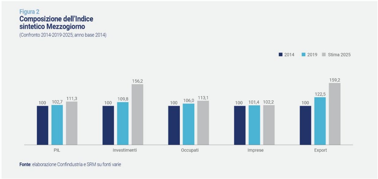 ROMA (ITALPRESS) – Il Check-up Mezzogiorno 2025, realizzato da Confindustria e SRM (Centro Studi collegato al Gruppo Intesa Sanpaolo), fotografa un Sud in progressivo recupero e rafforzamento strutturale. La dinamica di crescita, trainata dagli investimenti, negli ultimi anni è più sostenuta rispetto al resto del Paese, pur all’interno di un contesto macroeconomico e geopolitico complesso. Gli storici divari rispetto alle altre macroaree del Paese non sono superati, ma si registra un cambio di passo significativo, che apre una traiettoria credibile di convergenza. Nel 2025 l’Indice sintetico dell’economia meridionale raggiunge 641,9, tra Centro (666,5) e Nord (630), registrando una crescita di 6,1 punti dopo il rallentamento del 2024. Il PIL del Mezzogiorno cresce del +7,7% nel periodo 2019-2024, oltre la media nazionale (+5,8%). Nel 2024 la crescita è pari allo 0,7%, con prospettive di rafforzamento nel 2026 grazie anche all’attuazione del PNRR. Il PIL pro-capite sale a 22mila euro, restando ancora ben sotto la media italiana.