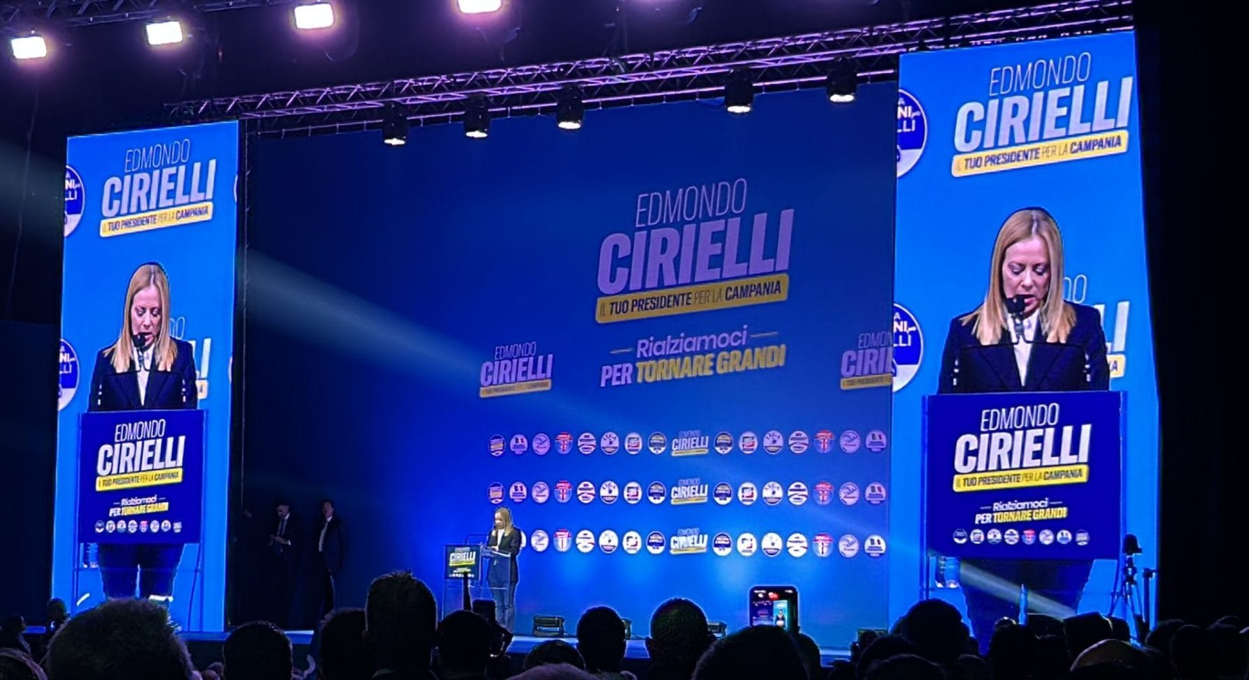 NAPOLI (ITALPRESS) – Un vero e proprio bagno di folla al PalaPartenope di Napoli dove si è conclusa da pochi minuti la manifestazione per sostenere la candidatura di Edmondo Cirielli alla presidenza della Regione Campania. Sul palco di Fuorigrotta tutti i leader del centrodestra e la premier Giorgia Meloni che ha tenuto il comizio conclusivo dopo gli interventi del numero uno di Noi Moderati, Maurizio Lupi, e dei due vicepremier, rispettivamente segretari di Lega e Forza Italia, Matteo Salvini e Antonio Tajani. Dopo le parole di Giorgia Meloni i leader si sono ritrovati sul palco con Cirielli mentre nell’arena risuonavano le note dell’Inno di Mameli. Subito dopo è esplosa la gioia del PalaPartenope con i tantissimi militanti presenti che hanno intonato il coro “chi non salta comunistà è”.